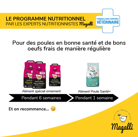 Découvrez les produits Magalli disponibles pour prendre soin de vos poules de compagnie.