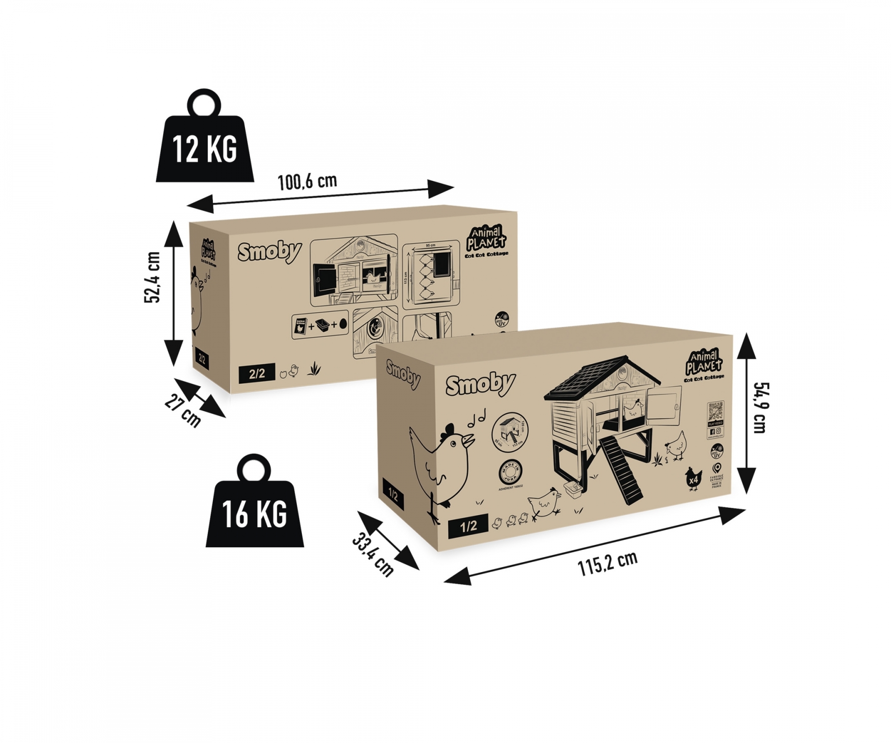 Poulailler livré en 2 cartons de 12 et 16 Kg (100,6 x 52,4  27 cm et 115,2 x 54,9 x 33,4 cm). Contient un livret de montage et d’informations ludiques ainsi qu’un œuf factice.
